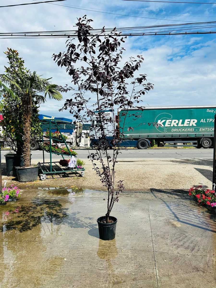 - Copacul crește cu tulpină puternică, formează o coroană rotundă, decorativă, cu frunzișul dens, culoare roșu-purpuriu.